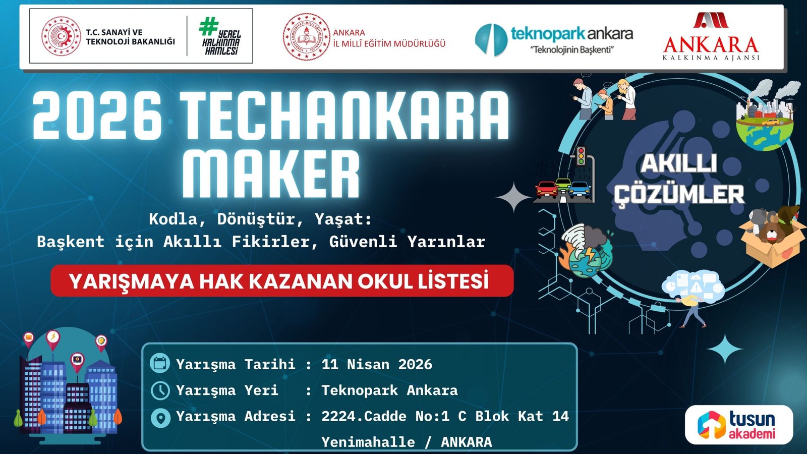 “Kodla, Dönüştür, Yaşat: Başkent için Akıllı Fikirler, Güvenli Yarınlar” temasıyla düzenlenen TechAnkara Maker Programı 2026 T.C. Sanayi ve Teknoloji Bakanlığı, T.C. Millî Eğitim Bakanlığı ve Ankara Kalkınma Ajansı iş birliğiyle, Teknopark Ankara ev sahipliğinde gerçekleştirilen yenilikçi bir teknoloji ve üretim programıdır. Yarışma ve eğitim süreçlerinin organizasyonu ise alanında uzman yüklenici firma Tusun Akademi tarafından yürütülmektedir. Ankara ilinde öğrenim gören resmi, özel kurumlara bağlı ortaokul ve BİLSEM öğrencilerine (10-14 yaş) yönelik olarak düzenlenen bir teknoloji ile üretim yarışmasıdır.